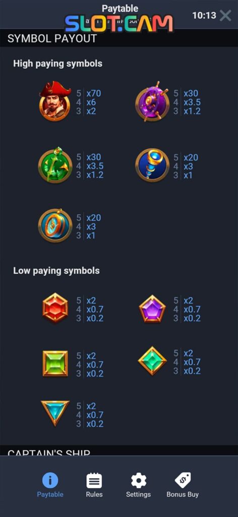 สัญลักษณ์ Captain’s Ship ทำหน้าที่เป็น Wild ซึ่งสามารถแทนที่สัญลักษณ์อื่นๆ บนวงล้อเพื่อช่วยสร้างแถวชนะ ที่สำคัญคือ Wild นี้สามารถมาพร้อม Multiplier (ตัวคูณ) ซึ่งจะช่วยเพิ่มมูลค่ารางวัลให้สูงขึ้นอีกหลายเท่าตัว